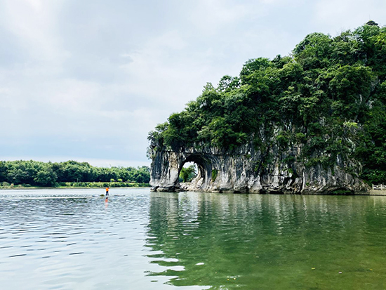 象鼻山,位于广西桂林市漓江与桃花江(旧称阳江)汇流处,是桂林山水之魂,也是桂林山水城徽,因其山形酷似一只巨象伸长鼻临江饮水而得名为“象鼻山”。象鼻山的象鼻和象腿之间形成一个面积约一百五十平米的圆洞,每当月明之夜,与江中的倒影,造就一轮临水明月,构成“象山水月”的奇景。