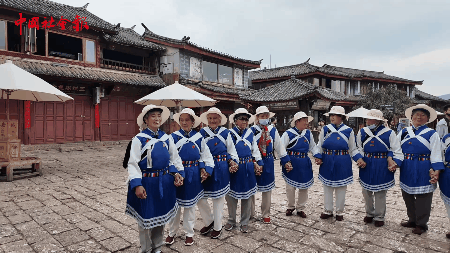 (身着纳西族传统服饰的老阿妈在“四方街”打跳,欢迎五湖四海的宾客。中国社会报记者 周亮 摄)