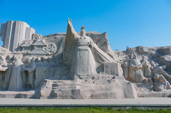 ▲秦始皇废除分封诸侯制,推行郡县二级制。图为陕西省西安市大秦文明园大型雕塑作品《文治》。(图片来源:视觉中国)