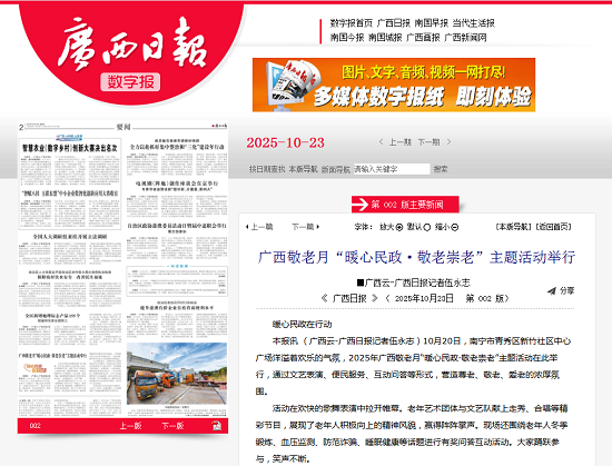 本报讯 (广西云-广西日报记者伍永志)10月20日,南宁市青秀区新竹社区中心广场洋溢着欢乐的气氛,2025年广西敬老月“暖心民政·敬老崇老”主题活动在此举行,通过文艺表演、便民服务、互动问答等形式,营造尊老、敬老、爱老的浓厚氛围。