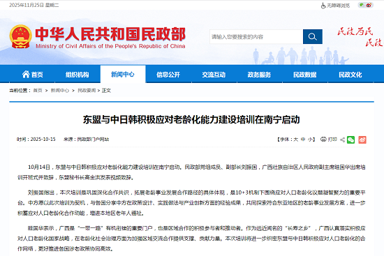 眭国华表示,广西是“一带一路”有机衔接的重要门户,也是区域合作的积极参与者和推动者。作为远近闻名的“长寿之乡”,广西认真落实积极应对人口老龄化国家战略,在老龄化社会治理方面为加强区域交流合作提供支撑、贡献力量。本次培训将进一步织密东盟与中日韩积极应对人口老龄化的合作网络,更好推进各国涉老政策协同高效。