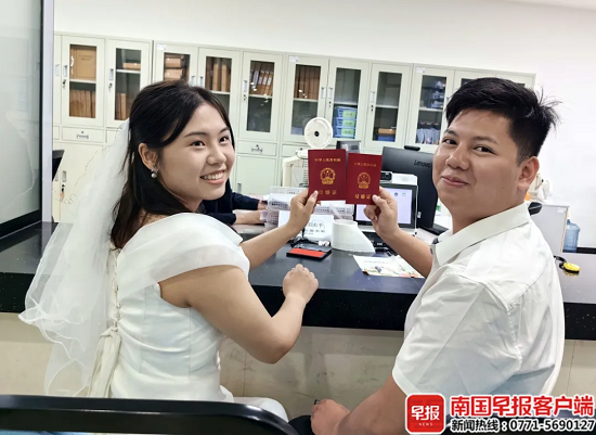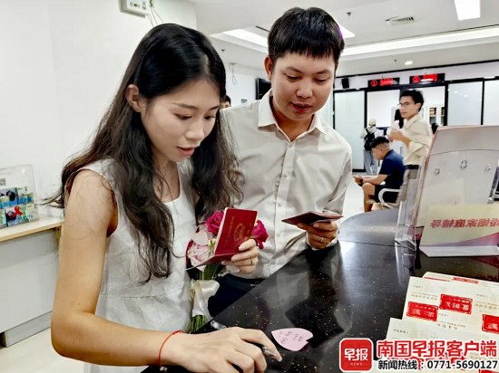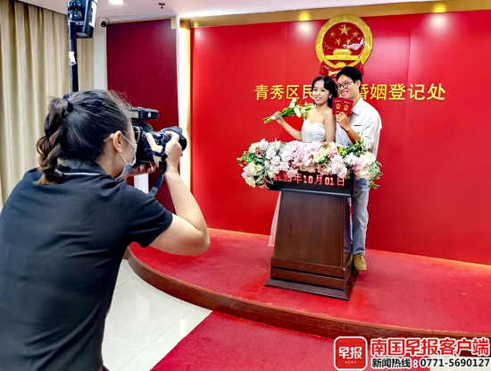 执子之手,家国同庆。国庆假期,不少准新人选择在举国欢庆的日子里携手步入婚姻殿堂。10月1日,南国早报全媒体记者走访发现,广西多个民政局婚姻登记处“为爱加班”,推出延时服务,打造特色专场,让准新人们顺利领到幸福“红本本”。