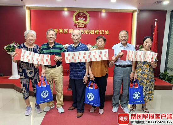 1979年国庆节,叶先生和郑女士登记结婚,46年来,夫妻二人一直相敬如宾,感情融洽。当天,青秀区民政局婚姻登记处特别邀请了他们和另外两对金婚、银婚周年纪念的模范夫妻来到现场,与大家分享婚姻家庭趣味小故事、夫妻相处之道,“夫妻婚姻的长久维系,就是要互敬互爱,互相包容和欣赏”。