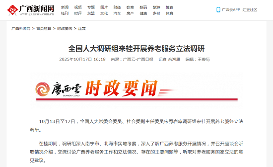 10月13日至17日,全国人大常委会委员、社会委副主任委员宋秀岩率调研组来桂开展养老服务立法调研。