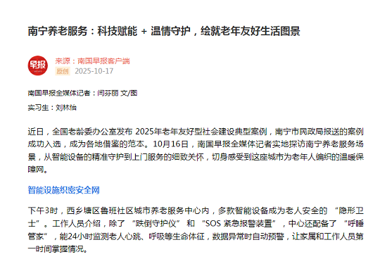 近日,全国老龄委办公室发布 2025年老年友好型社会建设典型案例,南宁市民政局报送的案例成功入选,成为各地借鉴的范本。10月16日,南国早报全媒体记者实地探访南宁养老服务场景,从智能设备的精准守护到上门服务的细致关怀,切身感受到这座城市为老年人编织的温暖保障网。