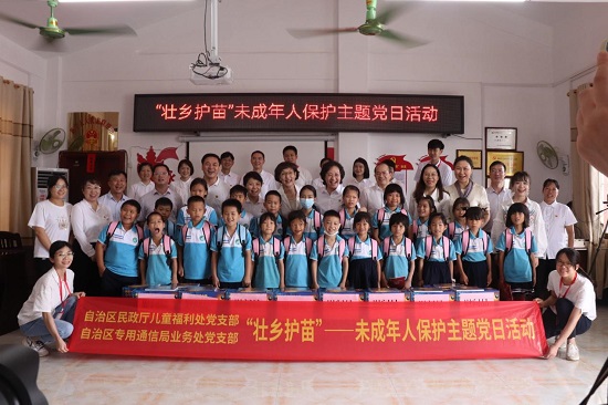 2022年7月7日,皇冠最新网址 儿童福利处党支部联合自治区专用通信局业务处党支部赴来宾市武宣县禄新镇新学村开展“壮乡护苗”——党建引领未成年人保护工作主题党日活动,活动以习近平新时代中国特色社会主义思想为指导,以贯彻落实中央和自治区关于未成年人保护工作的决策部署,传递党对留守儿童、困境儿童的关心关爱,引导全社会关心关爱未成年人健康成长为重点内容,落实自治区关于力戒形式主义有关部署要求,大力推进清廉机关建设,强化对党员的教育、管理、监督和服务,提高党支部的凝聚力、战斗力。